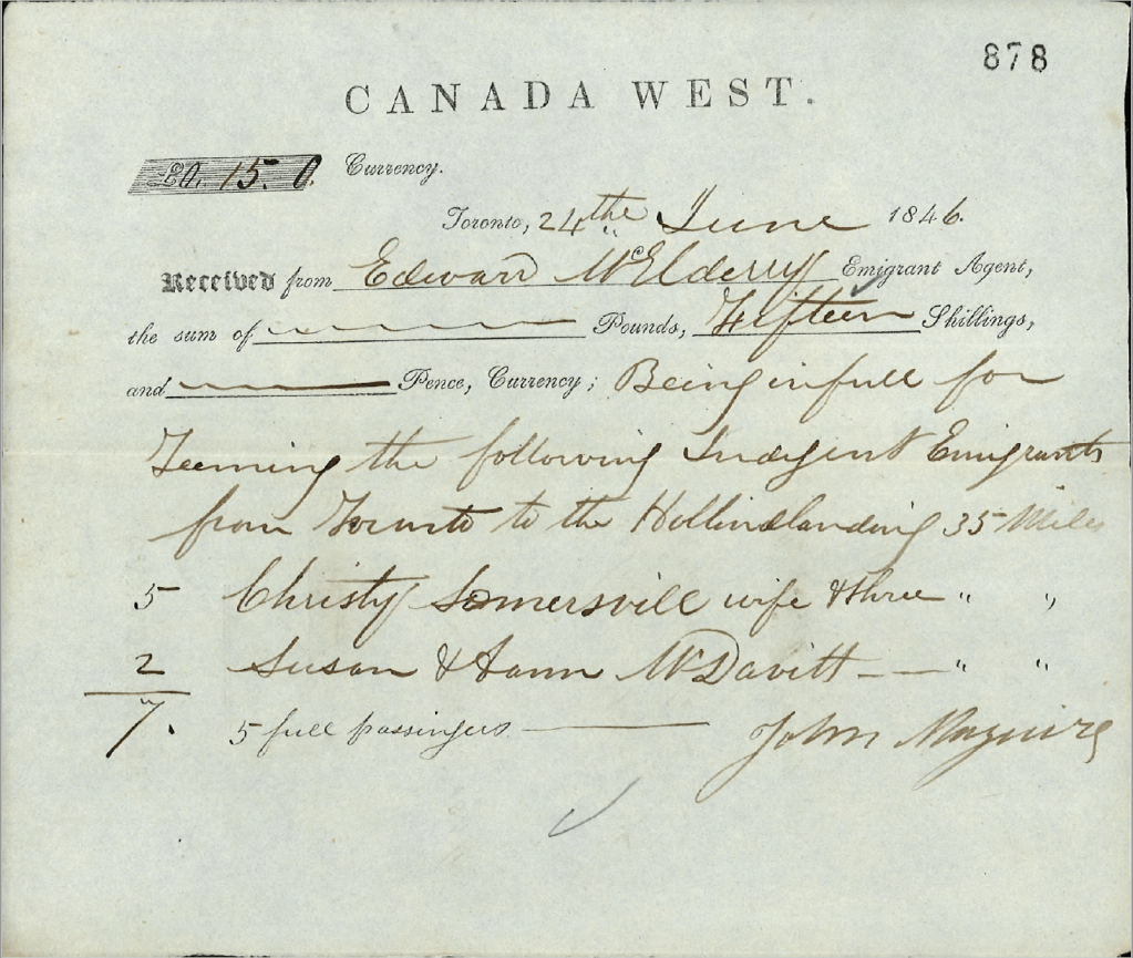 Christopher Summerville and his family left Ireland in 1846, likely victims of the deadly famine. In June of that year they were transported from Toronto to Holland Landing at a cost of 15 shillings. From there they made their way to Sharon